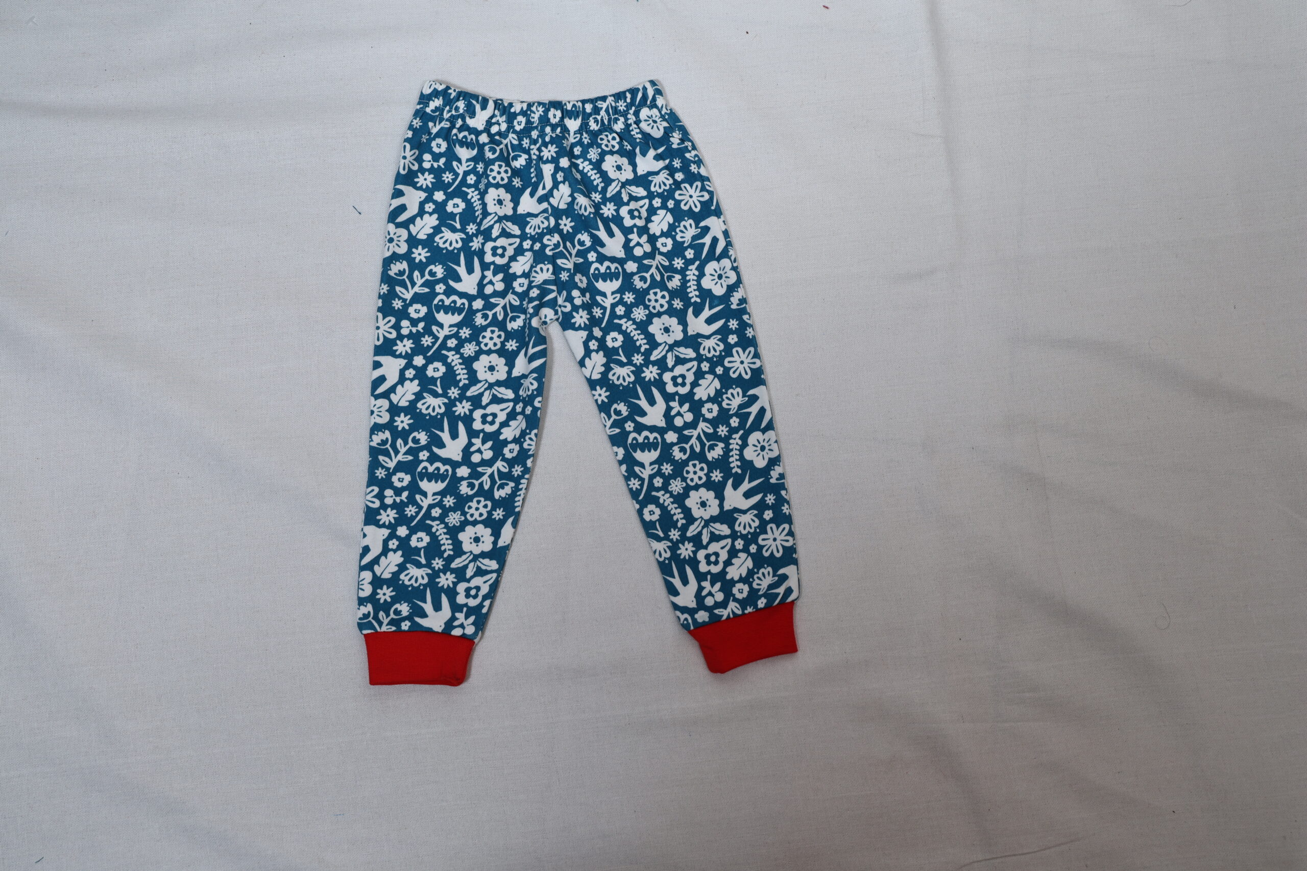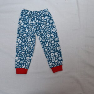 The image shows a pair of children’s pajama pants. The pants are Various colorful all-over print featuring red, navy blue, and green elements—such as butterflies, flowers, and leaves. The waistband is elastic, and the cuffs at the ankles are in Various color made from a ribbed fabric. The design and size indicate it’s meant for toddlers or young children.