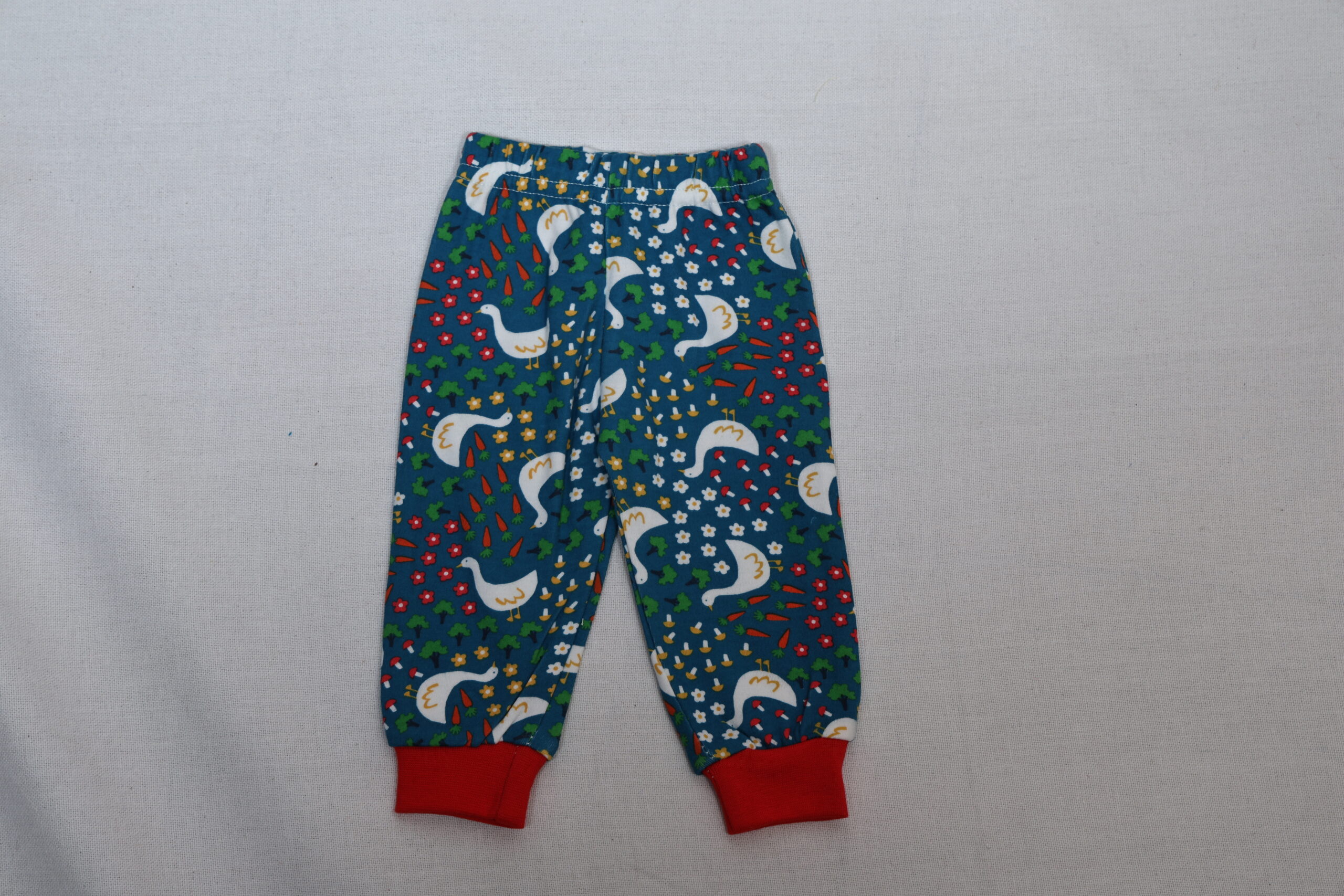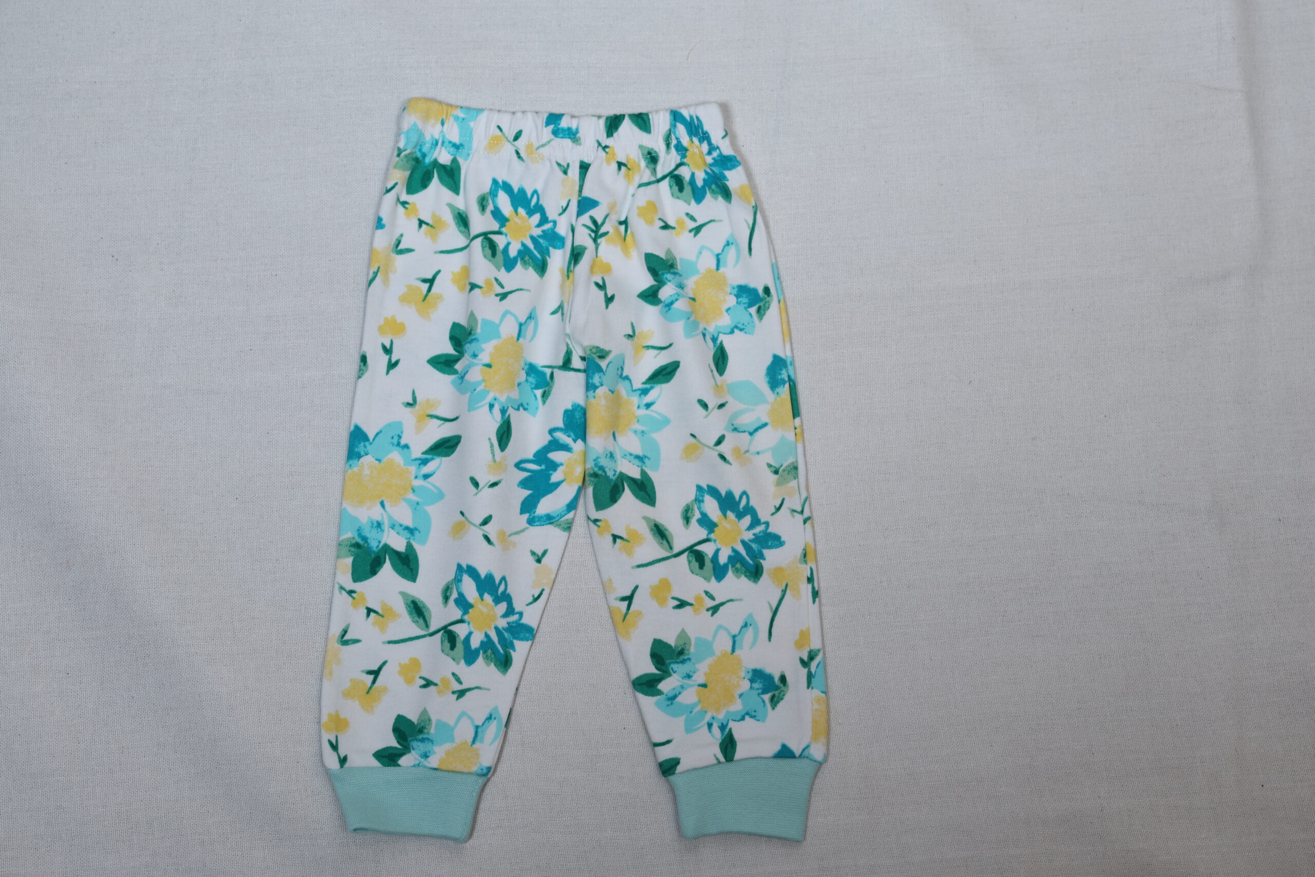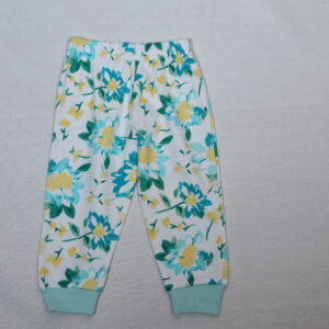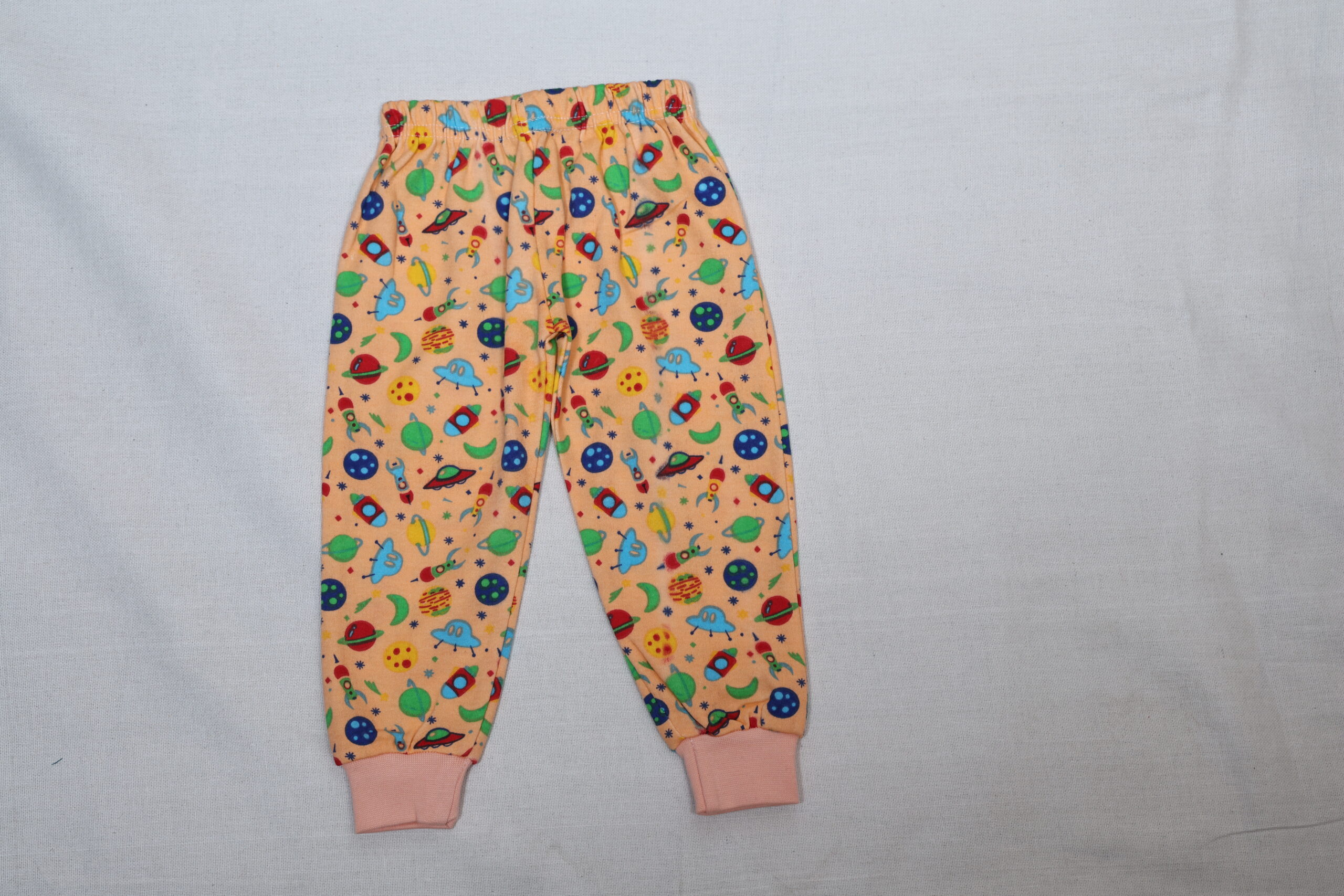 The image shows a pair of children’s pajama pants. The pants are Various colorful all-over print featuring red, navy blue, and green elements—such as butterflies, flowers, and leaves. The waistband is elastic, and the cuffs at the ankles are in Various color made from a ribbed fabric. The design and size indicate it’s meant for toddlers or young children.