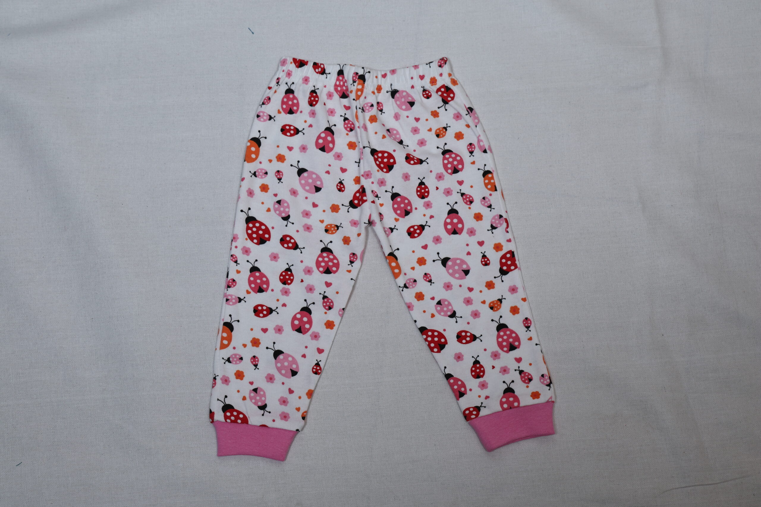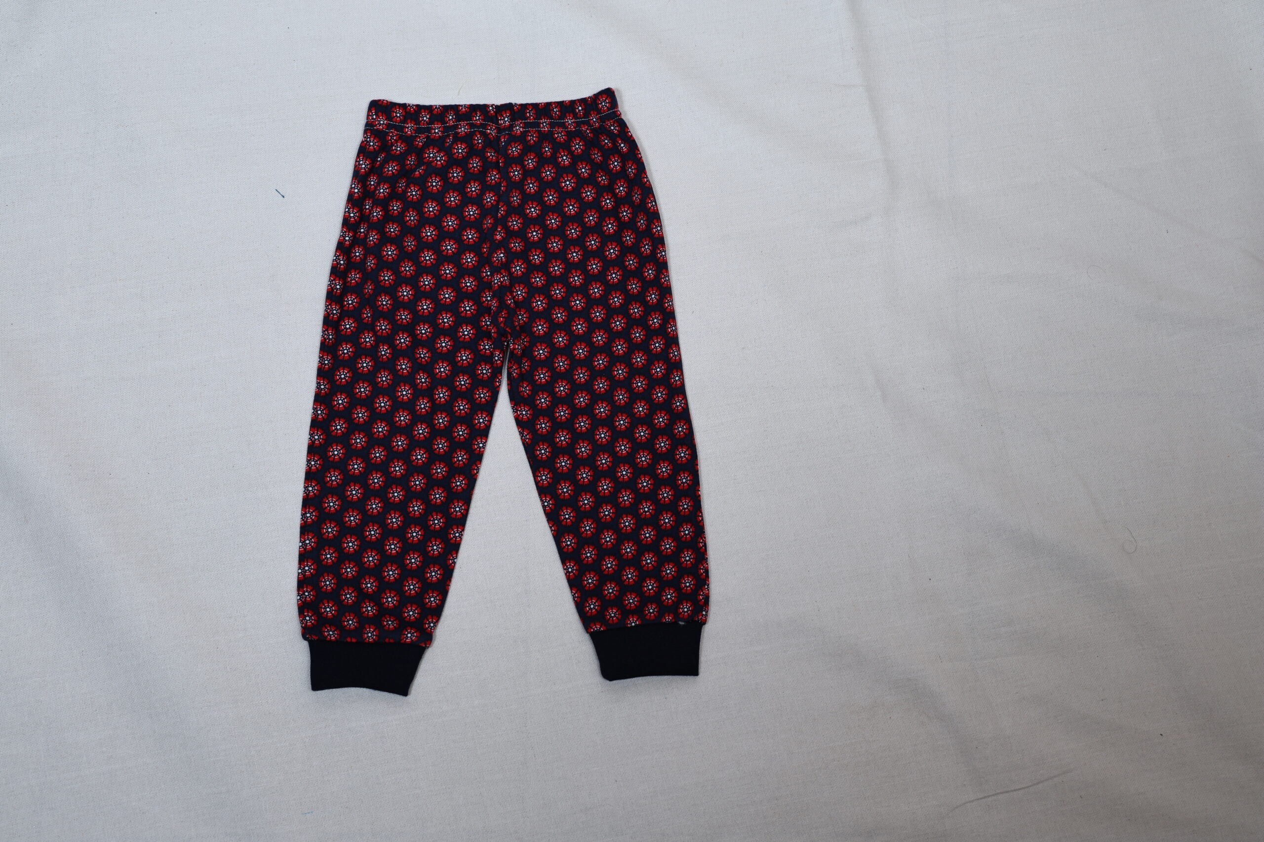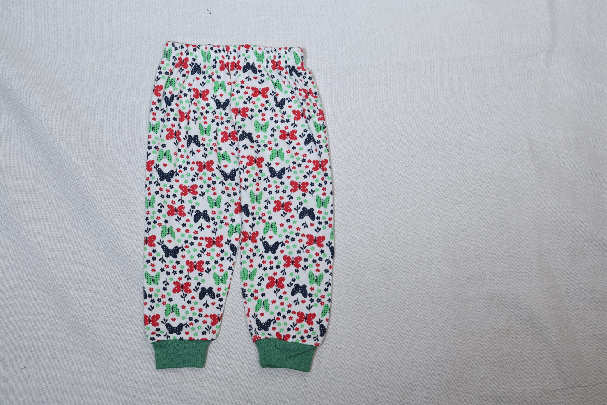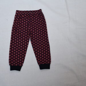 The image shows a pair of children’s pajama pants. The pants are Various colorful all-over print featuring red, navy blue, and green elements—such as butterflies, flowers, and leaves. The waistband is elastic, and the cuffs at the ankles are in Various color made from a ribbed fabric. The design and size indicate it’s meant for toddlers or young children.