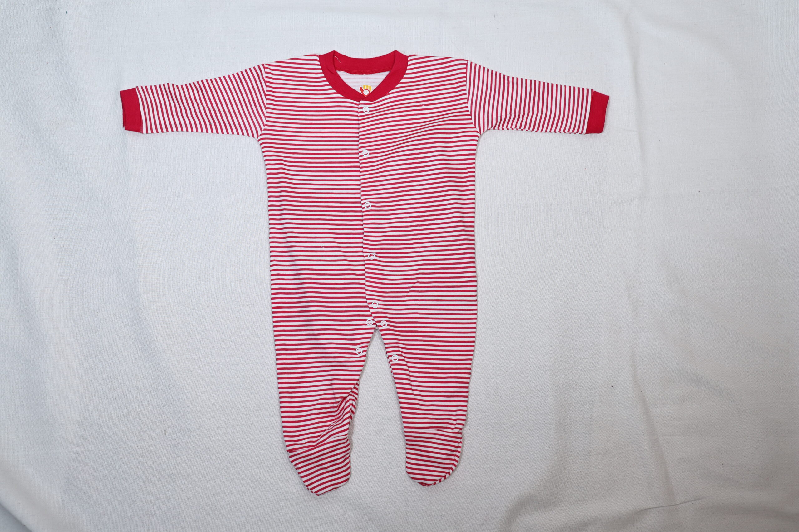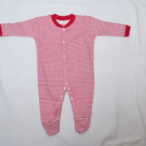 - This adorable baby’s red and white striped footed sleepsuit combines comfort and style, making it an essential addition to your little one’s wardrobe.