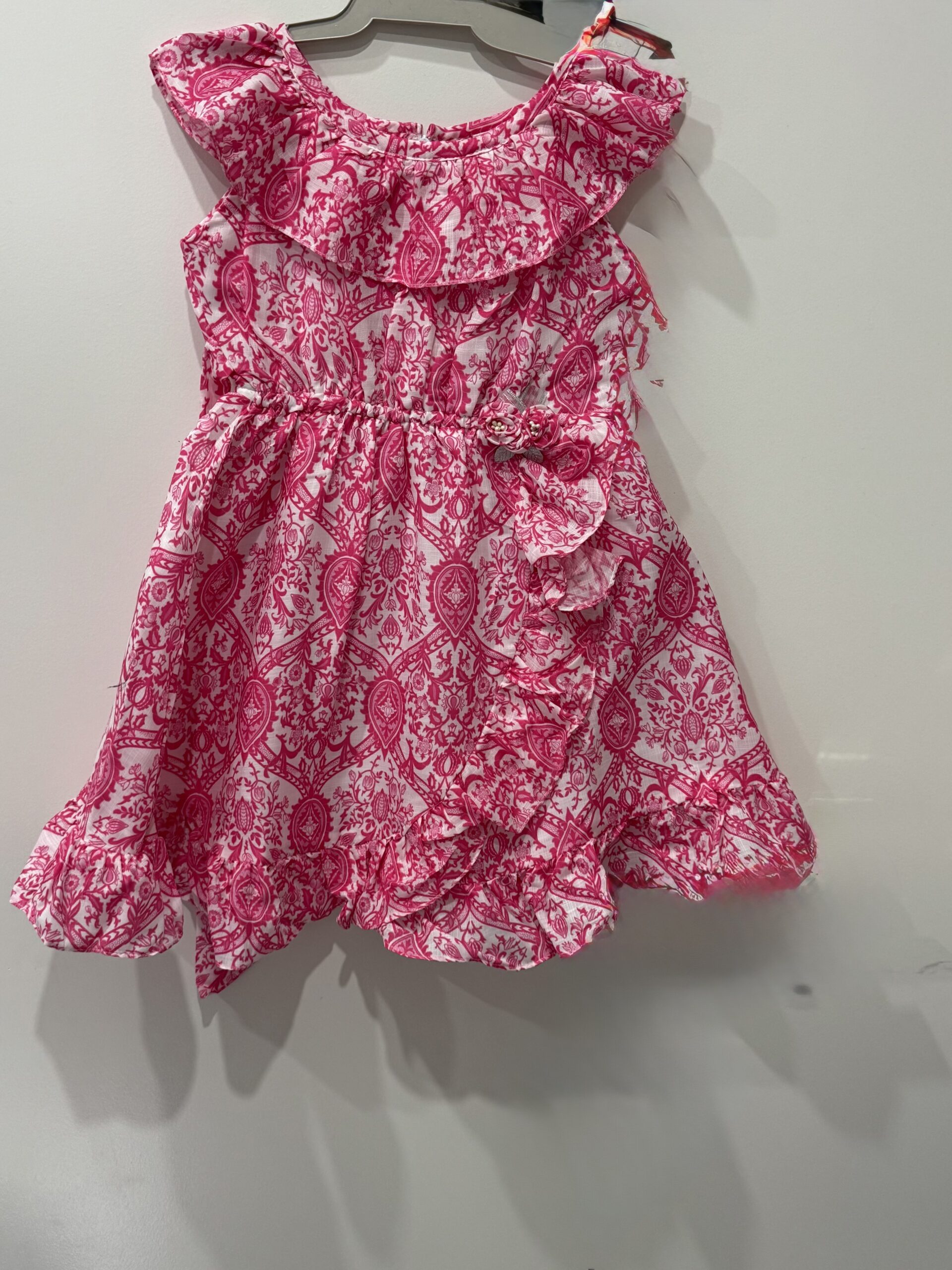 The image shows a young girl wearing dress with a flared skirt and ruffled cap sleeves. She is accessorized with a pink flower in her hair, pink earrings, a bracelet, and white shoes with bows. T